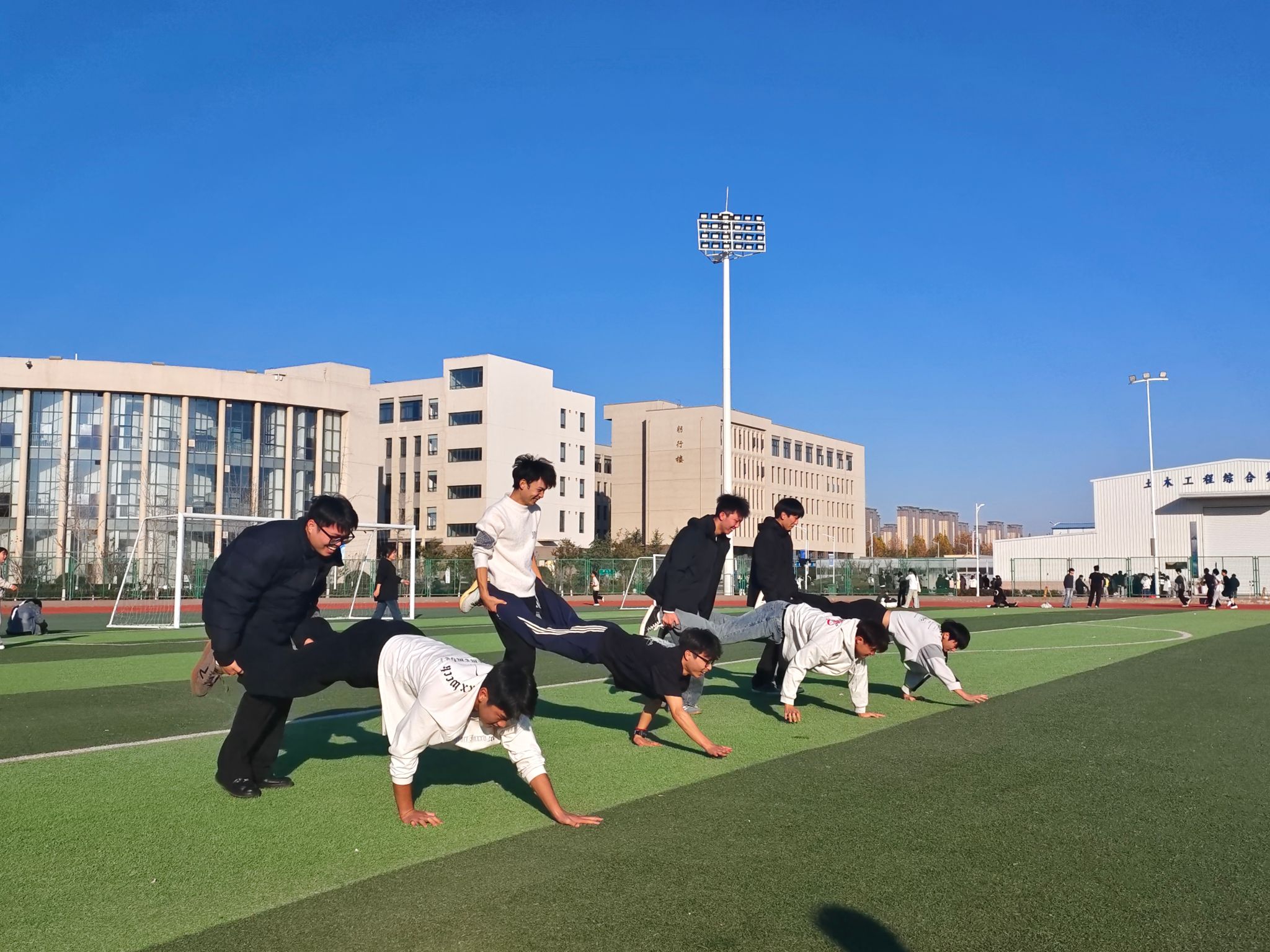 最引人注目的是趣味项目。“两人三足”比赛中,搭档们相互配合、稳步向前,用协作攻克难关;“贴烧饼”游戏考验着同学们的反应速度和敏捷性;而“小推车”项目则需要完美的配合与平衡能力。这些项目不仅有趣,更在欢声笑语中拉近了同学之间的距离。